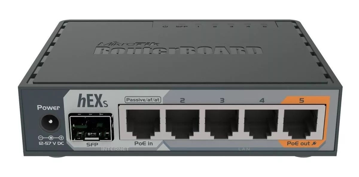 hEX S é um roteador Gigabit Ethernet de cinco portas para locais onde a conectividade sem fio não é necessária. Comparado ao hEX, o hEX S também apresenta uma porta SFP e saída PoE na última porta.